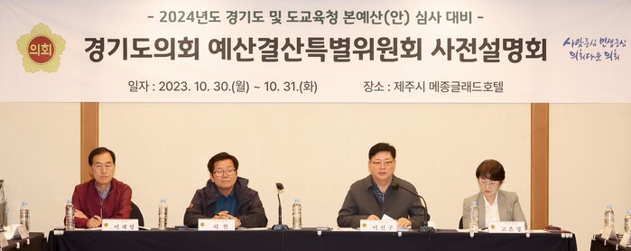 경기도의회 예산결산특별위원회(위원장이선구,부천2)는 10월30일~10월31일 양일간 제주특별자치도에서 2024년도 예산(안) 심사를 앞두고 경기도와 경기도교육청의 사전설명회를 개최하고 본격적인 활동에 들어갔다.