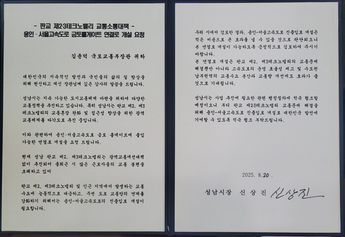 아울러 신 시장은 같은 날 또 다른 서한을 통해 판교 제2·3테크노밸리 교통문제 해결 방안으로 용인–서울고속도로 금토 톨게이트 연결로 개설을 요청했다.