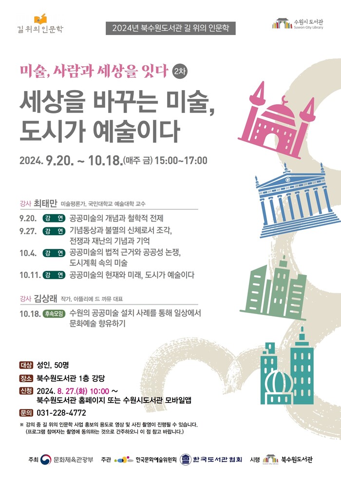 수원시 북수원도서관이 2024년 길 위의 인문학 ‘세상을 바꾸는 미술, 도시가 예술이다’ 강좌를 수강할 시민 50명을 8월 27일부터 모집한다.