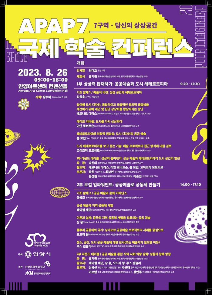 안양시가 주관하고 한국문화예술경영학회와 안양문화예술재단이 공동으로 기획 및 주관하는 이번 컨퍼런스는 한국, 미국, 프랑스 등 국내외 8개국 연사들이 참여해 각 주제에 대한 담론을 형성하고 현장 지식을 공유하는 학술 교류 행사다. 한국어와 영어 동시통역으로 진행되는 이번 행사는 ‘당신의 상상공간’이라는 주제 아래 1, 2부에 걸쳐 각각 ▲상상력 탑재하기: 공공예술과 도시 헤테로토피아, ▲로컬 임파워먼트: 공공예술로 공동체 만들기라는 소주제로 진행된다.
