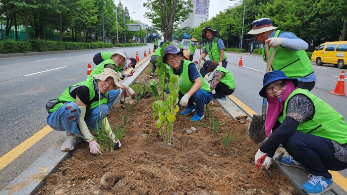 사진/수원시가로수정원봉사단이 식재 작업을 하고 있다.(사진제공=수원시)