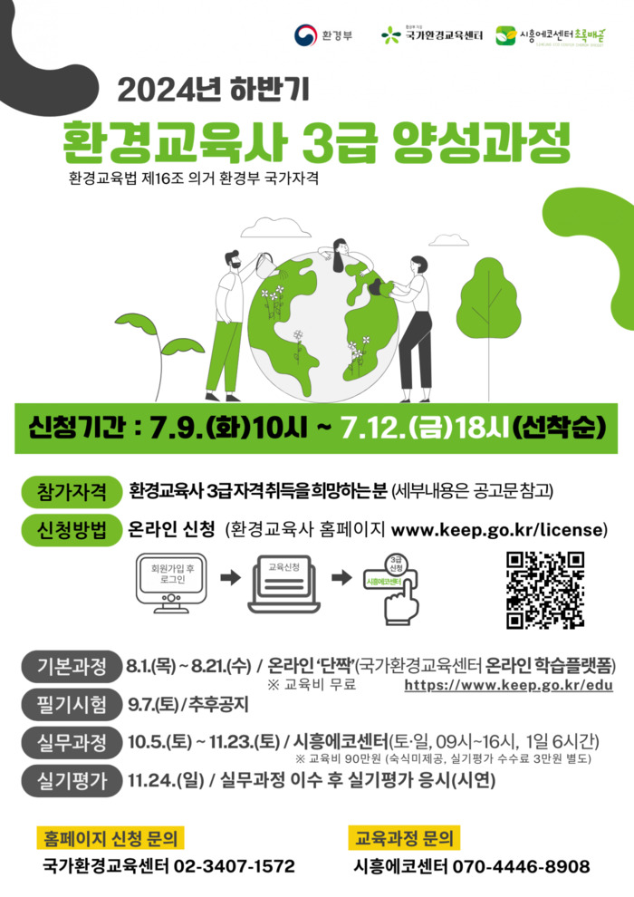 2024년 하반기 환경교육사 3급 양성 과정 문의는 시흥에코센터(070-4446-8908)로 하면 된다.