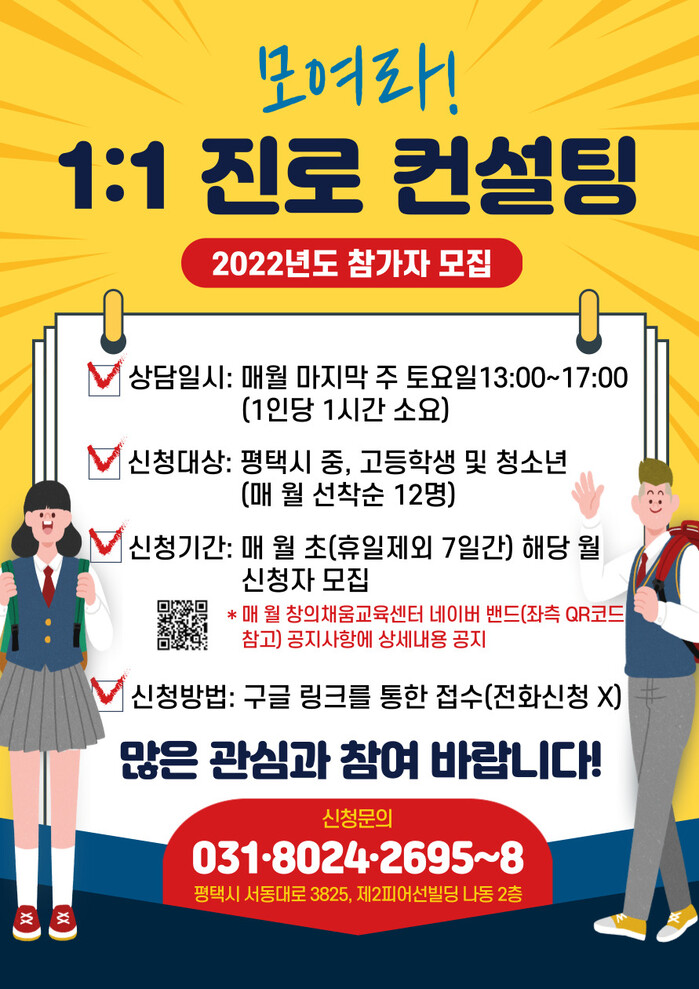 1:1 진로컨설팅은 매 월 마지막 주 토요일에 평택시창의채움교육센터에서 진행되며, 매 월 선착순 12명의 청소년이 참여할 수 있다. 3월 진로컨설팅 신청기간은 오는 11일(금)까지로 평택시창의채움교육센터 네이버 밴드에 공지되어 있는 구글 링크를 통해 신청할 수 있다.