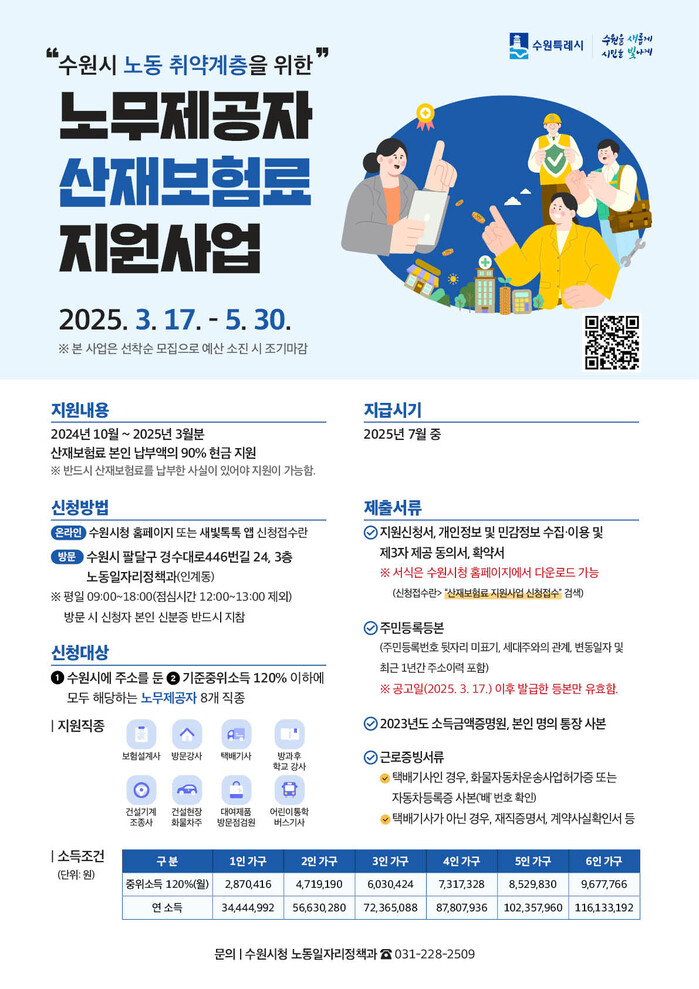 수원시는 5월 30일까지 ‘2025년 상반기 노동 취약계층 노무제공자 산재보험료 지원사업’ 신청을 받는다.