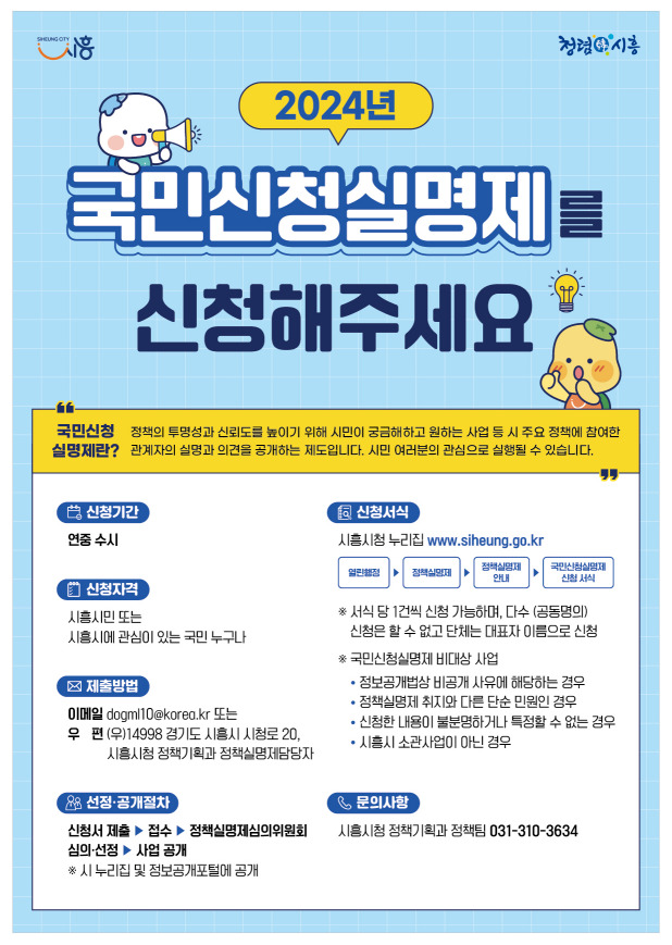 시흥시(시장 임병택)는 정책의 투명성과 책임성을 높이기 위해 ‘2024년 정책실명제’를 운영한다.