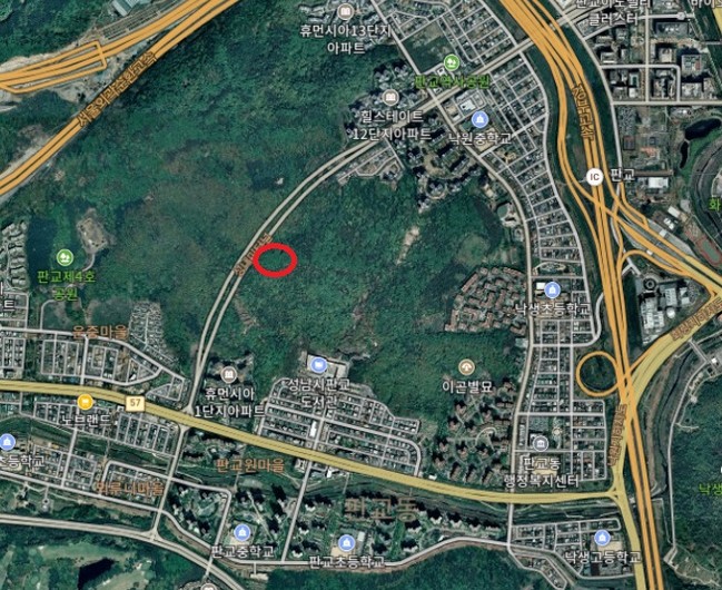 <사진/ 금토산 터널 위 반딧불이 생활터 되찾기 사업 대상지(빨간색 원표시)>