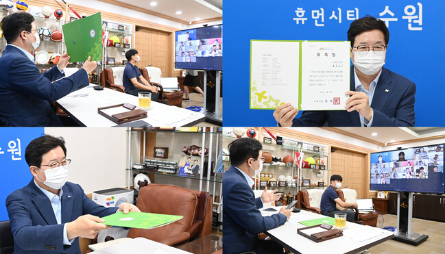 사진/염태영 시장이 비대면 방식으로 위촉장을 수여하고 있다. (사진제공=수원시)
