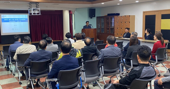 과천동회관 강당에서 열린 주민설명회에는 주민자치위원, 통장 등 과천동 주민 40여 명이 참석했으며, 시는 과천위례선 추진 동향과 GTX-C 사업 노선의 과천동 지역 통과 등에 대해 설명하고 주민 의견을 청취하는 시간을 가졌다.