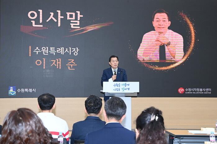사진/2024 나눔문화 프로젝트 해단식에서 이재준 수원시장이 인사말을 하고 있다.(사진제공=수원시)