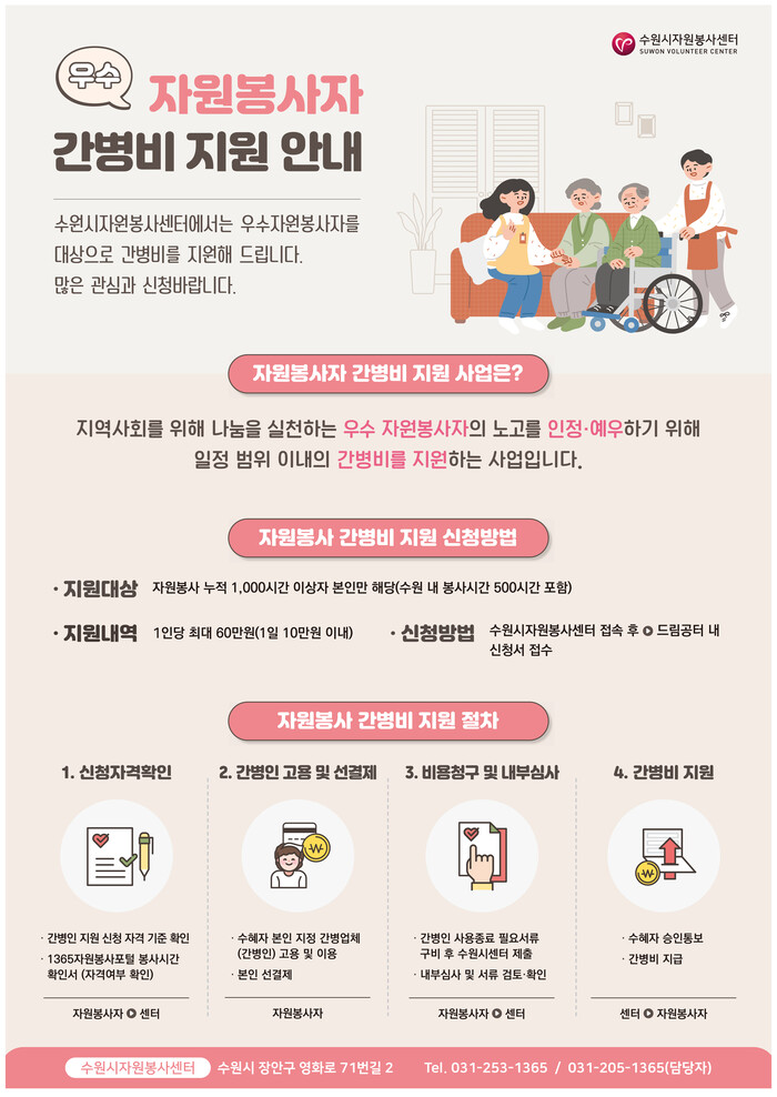 수원시자원봉사센터는 우수 자원봉사자의 노고를 인정·예우하기 위해 8일부터 간병비 지원을 시행한다.
