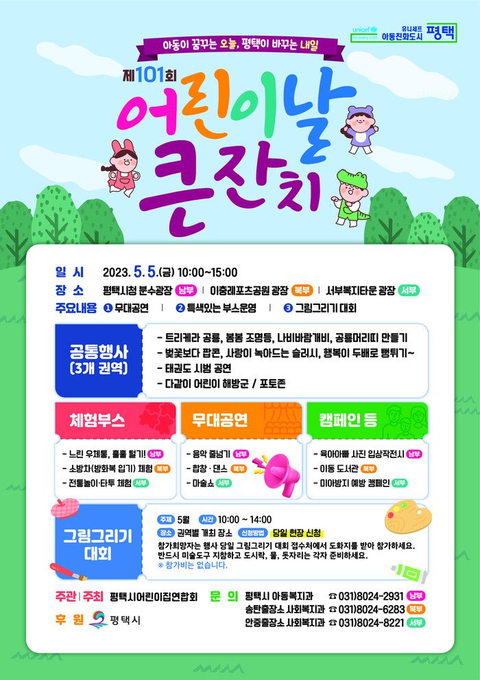 『제101회 어린이날 큰잔치』 ‘아동이 꿈꾸는 오늘, 평택이 바꾸는 내일’을 주제로 개최하는 이번 행사는 공모 절차를 통해 보조사업자로 선정된 평택시어린이집연합회에서 주관하며, 평택시유치원연합회 등 6개 단체로 구성된 어린이날 행사 추진단이 협업으로 추진하며 평택시가 후원한다. 아울러 시민들이 가까운 장소에 방문하여 행사를 즐길 수 있도록 평택시청 분수 광장, 이충레포츠공원 광장, 서부복지타운 광장 등 3개 권역별로 나누어 분산 개최하며 ▶공통체험부스 ▶지역별 특색 있는 체험부스 ▶태권도 시범공연 등 무대공연 ▶‘5월’을 주제로 한 그림그리기(대회) 등 프로그램이 진행된다.