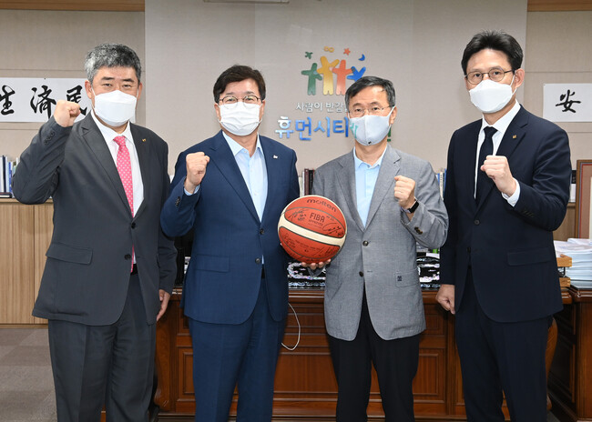 사진/염태영 시장(왼쪽 2번째), 남상봉 사장(오른쪽 2번째), 최현준 단장(왼쪽 1번째), 서동철 감독(오른쪽 1번째)가 함께하고 있다. (사진제공=수원시)