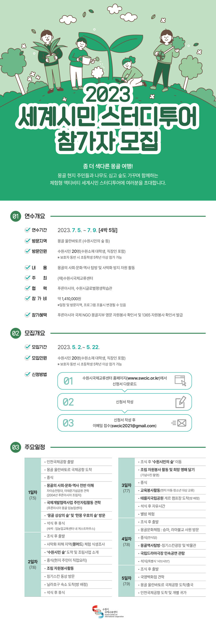 2023 세계시민 스터디투어는 몽골 울란바토로 일원을 탐방하며 사회‧문화‧역사를 이해하고, 사막화를 방지하기 위해 수원시가 조성한 ‘수원시민의 숲’에서 조림(造林) 자원봉사 활동 등을 하는 프로그램이다. 현지에서 교육봉사활동을 하며 주민들과 교류도 한다.