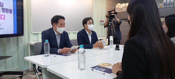 사진/김동연 더불어민주당 경기도지사 후보(왼쪽 두번째)와 최대호 안양시장 후보가 4일 오후 안양 범계역 청년공간인 ‘청년출구’에서 청년대표들과 만나 의견을 듣고 있다.(사진제공=최대호 캠프]
