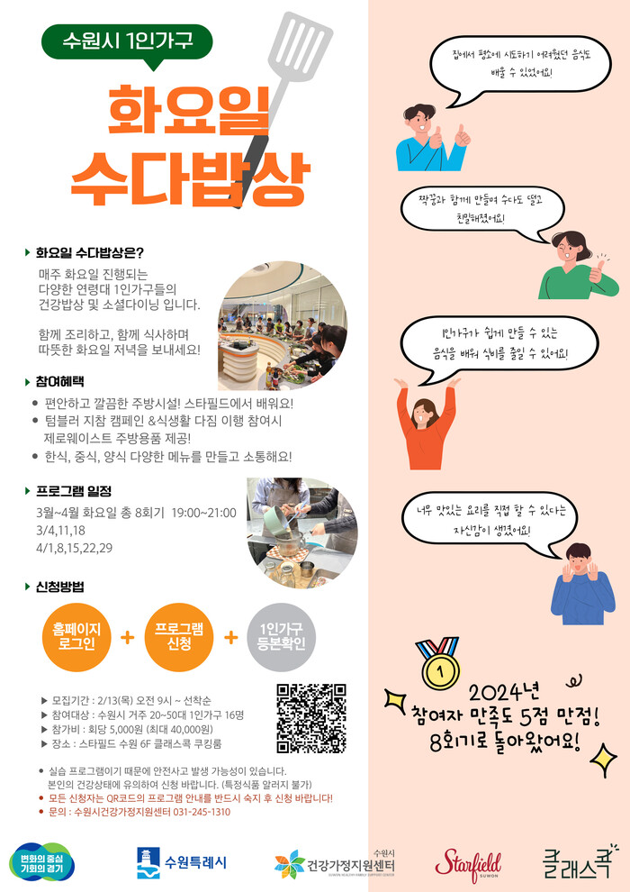 수원시 관계자는 “실생활에 도움이 되는 요리를 배우며, 소통할 기회를 제공하겠다”며 “1인 가구가 더 건강하고 균형 잡힌 삶을 살아갈 수 있도록, 지역사회에서 소통과 연결을 강화하는 데 힘쓰겠다”고 밝혔다.