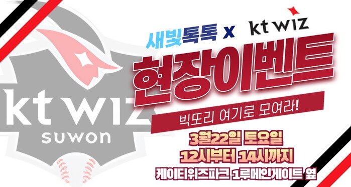 KT 위즈와 한화 이글스의 개막전을 앞두고, 정오부터 오후 2시까지 수원시 공식캐릭터 수원이와 함께 새빛톡톡 가입과 이벤트 참여를 유도할 예정이다.