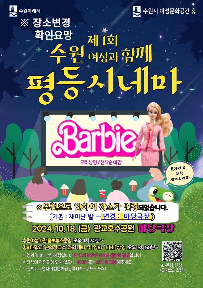 수원시 여성문화공간-휴(休)가 18일 양성평등 문화확산을 위한 시민 참여 프로그램 ‘제1회 수원여성과 함께 평등시네마’를 광교호수공원 마당극장에서 연다.