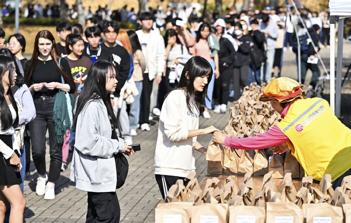 사진/지난 2일 수원 성균관대학교 자연캠퍼스에서 열린 ‘찾아가는 사랑의 밥차’에 참여한 대학생들이 줄지어 서 있다.(사진제공=수원시)