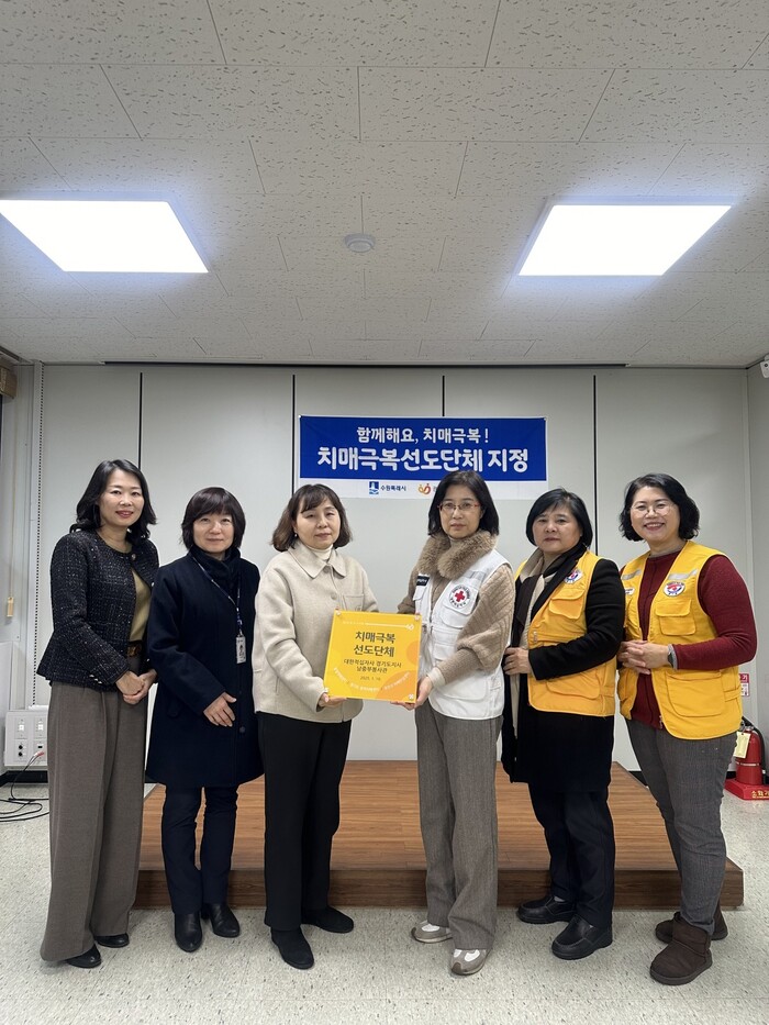 수원시 권선구보건소가 치매극복선도단체로 지정한 대한적십자사 경기도지사 남중부봉사관에 12일 현판을 전달하고, 협력 방안을 논의했다.