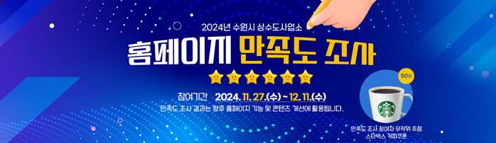 설문조사 내용은 홈페이지 기능·콘텐츠 만족도, 수원시 상수도사업소 홈페이지 사이버 요금 창구 만족도, 기능 개선 건의 사항 등이다.