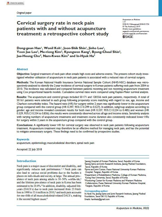 우리나라의 인구 천명당 척추수술 비율은 2007년 2.38건에서 2013년 3.36건으로 약 46% 증가했다. 국민건강보험에서 급여로 보장한 척추수술의 총 진료비도 2007년 3,654억원에서 2013년 5,010억원으로 약 40% 증가했다. 이러한 상황에서 침치료가 목 통증 환자의 경추수술을 감소시킨다는 연구결과가 나와 눈길을 끈다.