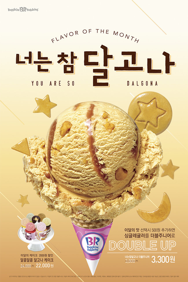 이달의 맛 ‘너는 참 달고나’는 추억 속 달고나를 아이스크림으로 재해석한 맛이고, ‘달콤달콤 달고나 케이크’는 ▲베리베리스트로베리, ▲레인보우샤베트, ▲엄마는외계인, ▲아몬드봉봉, ▲쿠키앤크림, ▲블루베리치즈케이크, ▲이상한나라의 솜사탕의 7가지 맛으로 구성되었다.