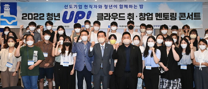 사진/이재준 시장(가운데)이 ‘2022년 청년UP 클라우드 취·창업 멘토링 콘서트’에 참가한 청년들과 함께하고 있다.(사진제공=수원시)
