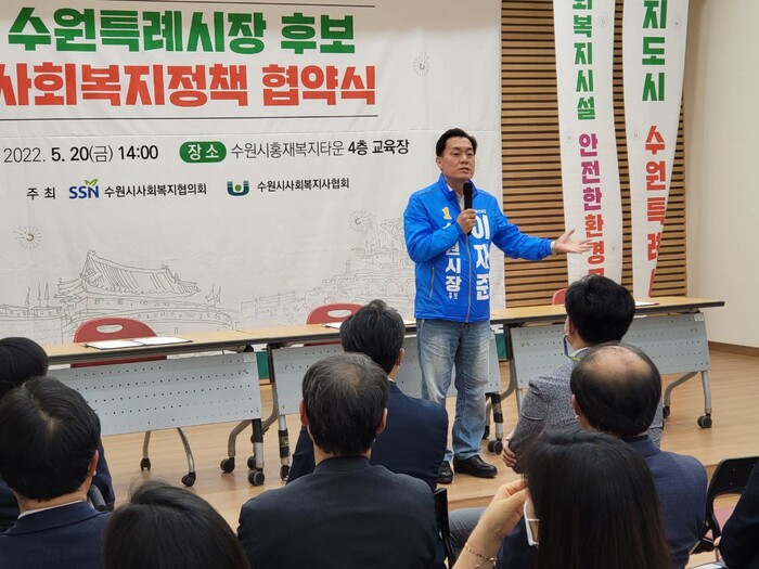 이날 이재준 수원시장 후보는 수원시사회복지협의회와 수원시사회복지사협회의 주최하에 수원시홍재복지타운에서 열린 ‘수원특례시장 후보 사회복지 정책제안 협약식’에 참석했다.