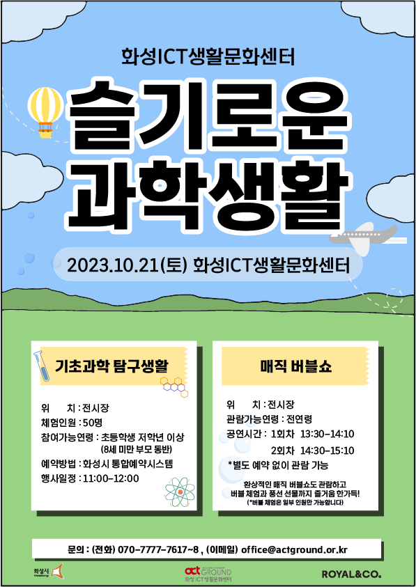 슬기로운 과학생활 행사는 화성시통합예약시스템에서 사전 예약을 통해 참여할 수 있으며, 매직 버블쇼 공연은 별도 예약 없이 관람이 가능하다. 자세한 사항은 화성ICT생활문화센터 홈페이지에서 확인할 수 있다.