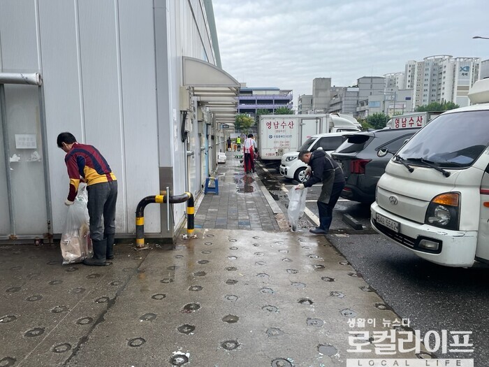 도매시장 보도와 차도, 지상·지하 주차장, 녹지공간, 흡연부스 등 이용객이 많이 찾는 구역을 청소했다. 법인·조합별로 책임 구역을 나눠 쓰레기를 수거했다.
