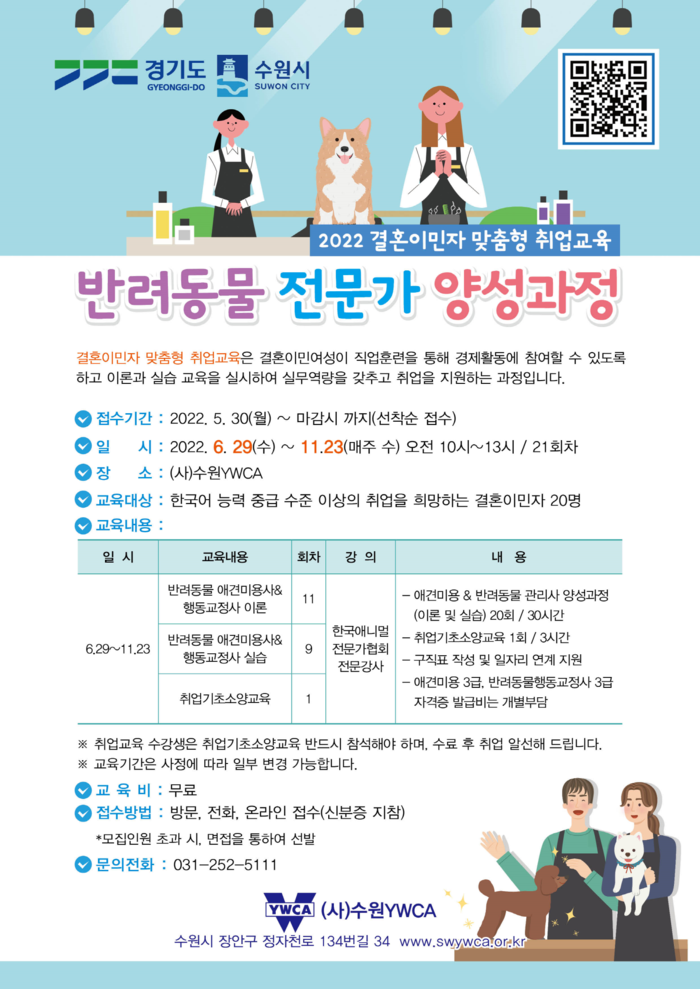 ㈔수원YWCA 홈페이지(https://swywca.or.kr) 공지사항에 게시된 ‘결혼이민자 반려동물 전문가 양성과정 수강생 모집’에서 홍보물 큐알(QR)코드를 스캔하거나, 방문(장안구 정자천로134번길 34) 또는 전화(031-252-5111)로 신청하면 된다.