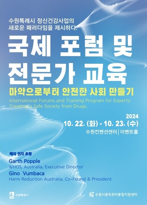 수원시중독관리통합지원센터가 10월 22~23일 수원컨벤션센터에서 ‘마약으로부터 안전한 사회 만들기’ 국제 포럼·전문가 교육을 개최한다.