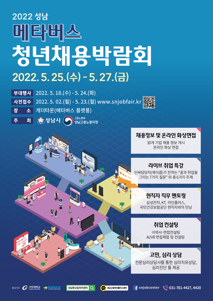 성남시는 오는 5월 25일부터 27일까지 메타버스(3차원 가상세계)를 활용한 온라인 청년취업박람회를 성남고용복지플러스센터와 공동으로 개최한다.