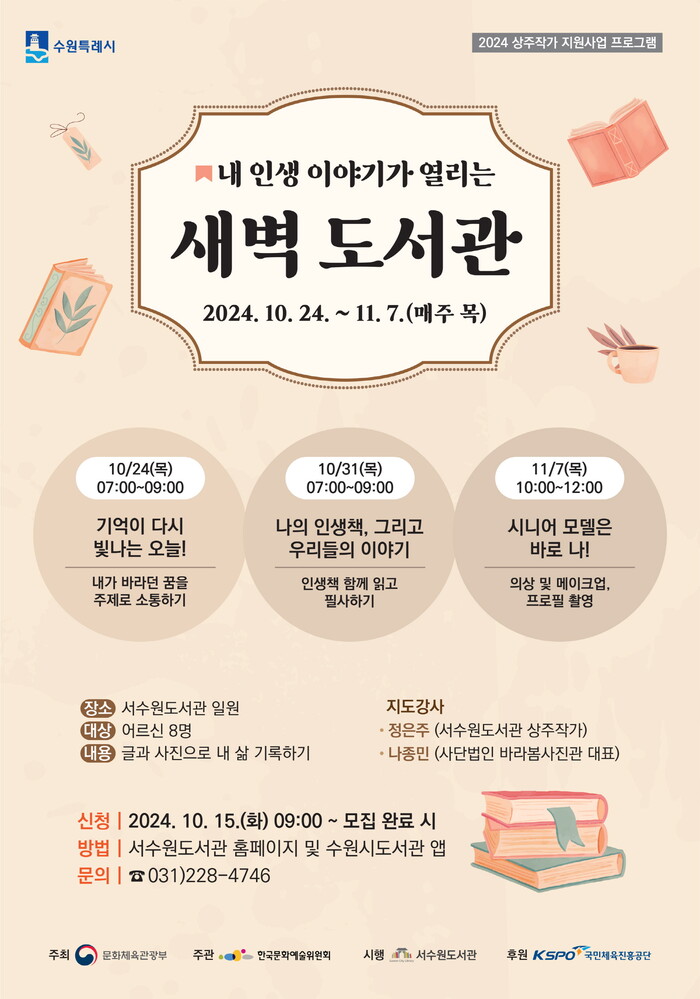 어르신을 대상으로 한 ‘내 인생 이야기가 열리는 새벽도서관’은 10월 24일부터 11월 7일까지 매주 목요일 오전에 운영된다. 65세 이상 어르신들에게 인생책 필사하기, 프로필 사진 촬영하기 등 내 삶을 기록해 보는 프로그램을 제공한다. 정은주 서수원도서관 상주작가, 나종민 바라봄사진관 대표가 강의한다. 어르신 8명을 모집한다.