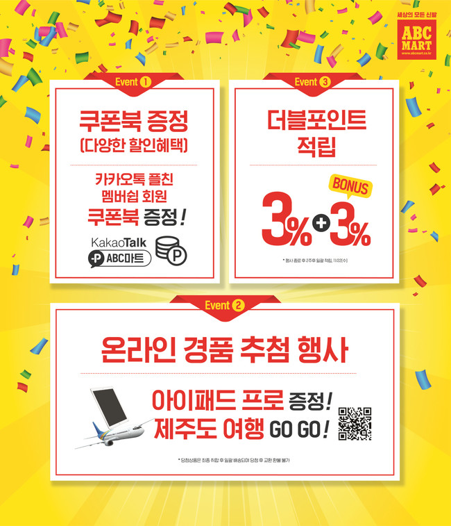 이 밖에도, ABC마트 온라인몰에서는 오는 11월 23일(목)까지 경품 추첨 이벤트를 진행한다. ABC마트 200호점이 오픈되는 지역을 맞추는 퀴즈 이벤트 방식으로 진행되며, 정답을 맞춘 응모자에게 추첨을 통해 제주 에어텔 패키지(10명), 아이패드 프로(5명), ABC마트 상품권 5만원권(50명), 커피음료고환권(200명) 등을 경품으로 증정한다. 당첨자 발표는 29일 이후 ABC마트 온라인몰에서 확인할 수 있다.