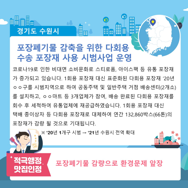 행정안전부는 최근 수원시의 ‘포장폐기물 감축을 위한 다회용 수송 포장재 시범사업’·‘시내버스 불편사항 큐알(QR)코드로 신고하세요’를 비롯한 6건을 ‘지자체 적극행정 맛집’으로 선정했다.