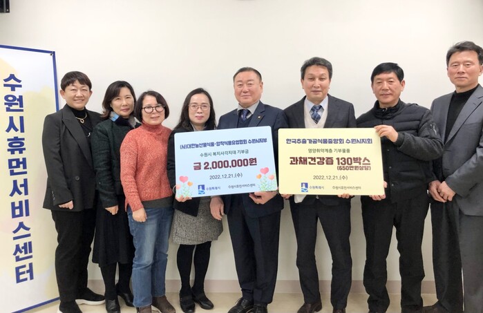21일 수원시휴먼서비스센터에서 열린 전달식에서 (사)대한농산물식품·압착식용유업협회 수원시지부는 200만 원을, 한국추출가공식품업중앙회경기도지부 수원시지회는 과채 건강즙 130상자(650만 원 상당)를 수원시 관계자에게 전달했다.