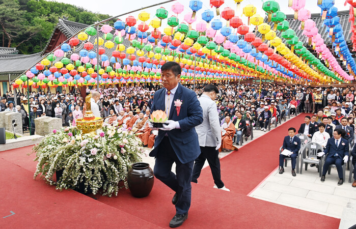 이번 법요식은 부전스님의 명종 5타를 시작으로 도량결계(꽃과 향수를 뿌리며 동자, 동녀가 입장), 동공양, 삼귀의례, 봉축사, 청법가에 이어 성효스님(용주사 주지스님)의 봉축법어, 발언문, 관불의식 순으로 진행됐다.