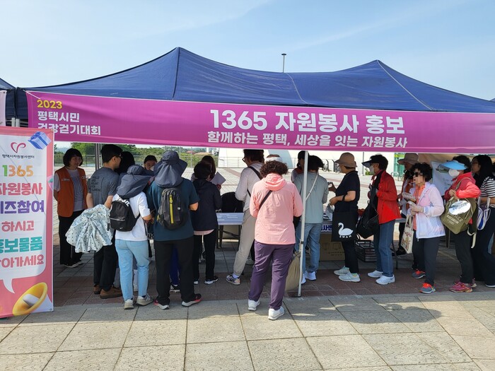 평택시자원봉사센터(센터장 손영희)는 지난 20일(토) ‘2023 평택시민 건강걷기대회’를 맞이하여 이충레포츠 공원에서 ‘1365 자원봉사 홍보’를 진행했다.