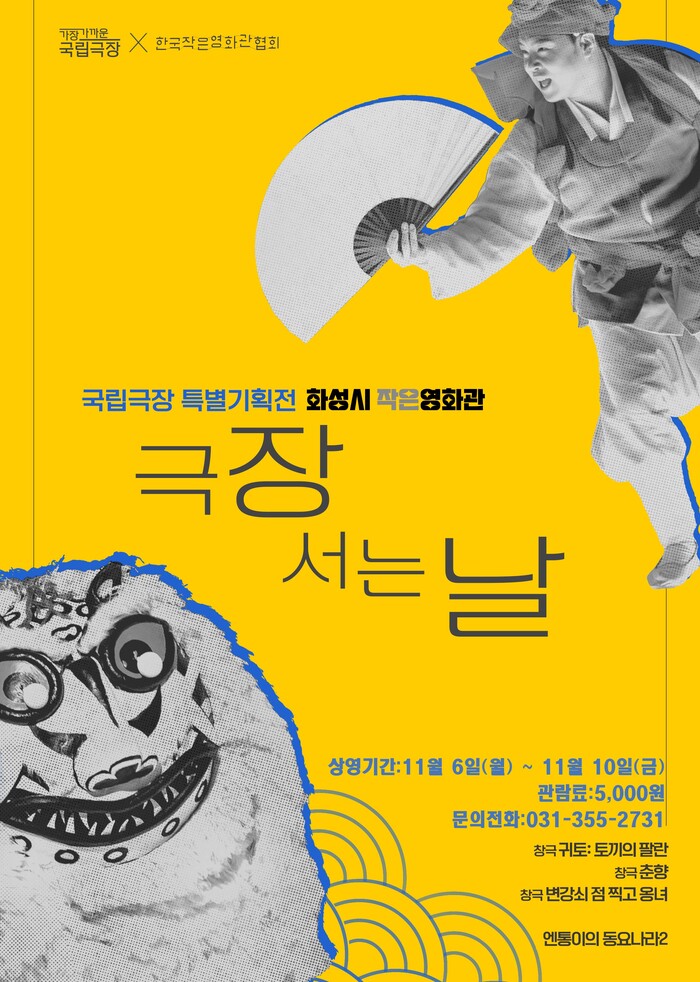 화성시 작은영화관이 국립극장의 우수 창작 공연 실황을 상영하는 국립극장 기획전‘극장 서는 날’을 오는 11월 6일부터 10일까지 5일간 개최한다.