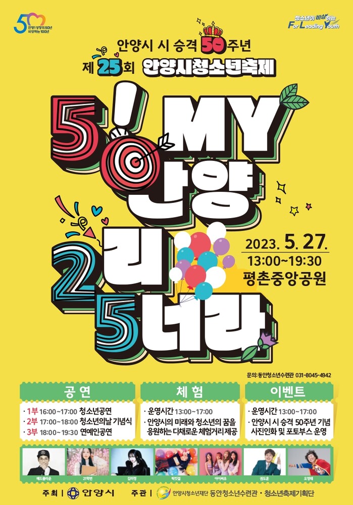 이에 따라, 시 승격 50주년 기념 추억 사진관, 미래 안양 100년 소망 엽서 쓰기 등 특별행사와 Y2K키링·우정팔찌 만들기, 타투스티커 체험, 퀴즈 맞추기 등 청소년의 관심사에 맞춘 35개 체험행사가 평촌중앙공원을 가득 채울 예정이다.