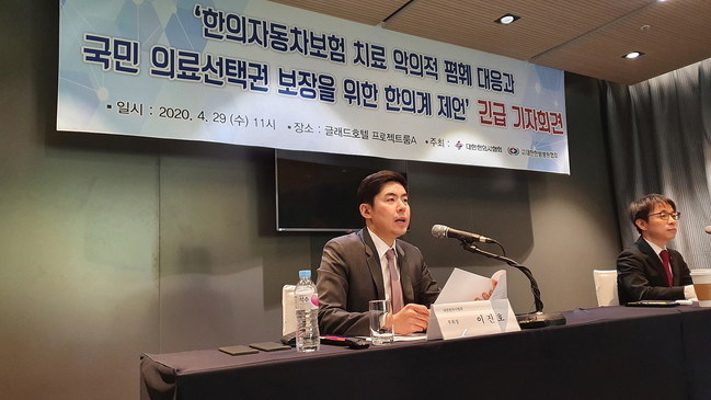 [사진/ 대한한방병원협회와 대한한의사협회가 29일 여의도 글래드호텔 프로젝트룸A에서 개최한 긴급 기자회견에서 대한한방병원협회 이진호 부회장(왼쪽)이 발언하고 있다]