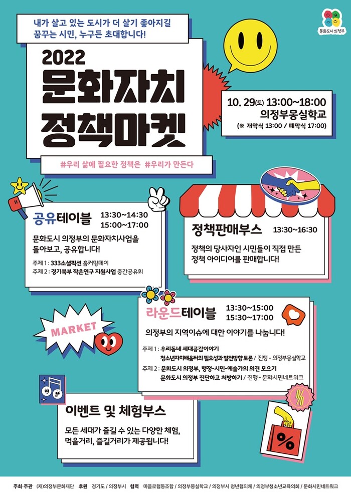 의정부시(시장 김동근)는 10월 29일 토요일, 의정부몽실학교에서 시민의 목소리로 만든 정책아이디어를 전시·홍보하는 문화자치 정책마켓을 진행한다.