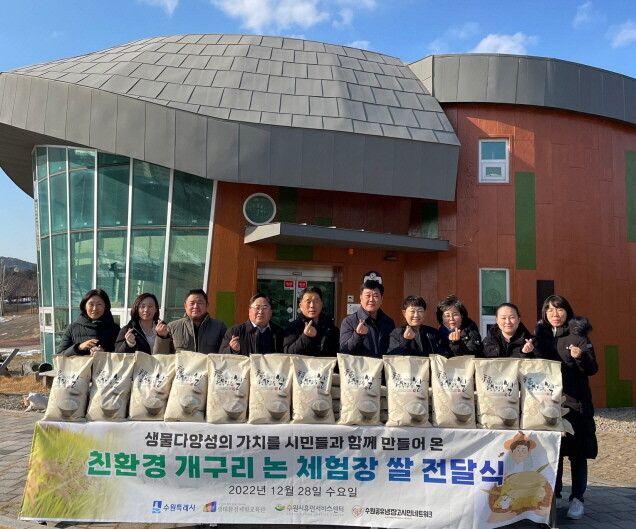 이날 기부한 쌀은 수원시가 생태학습장으로 운영하고 있는 호매실동 친환경 논체험장 개구리논에서 유기농 방식으로 재배한 것이다.