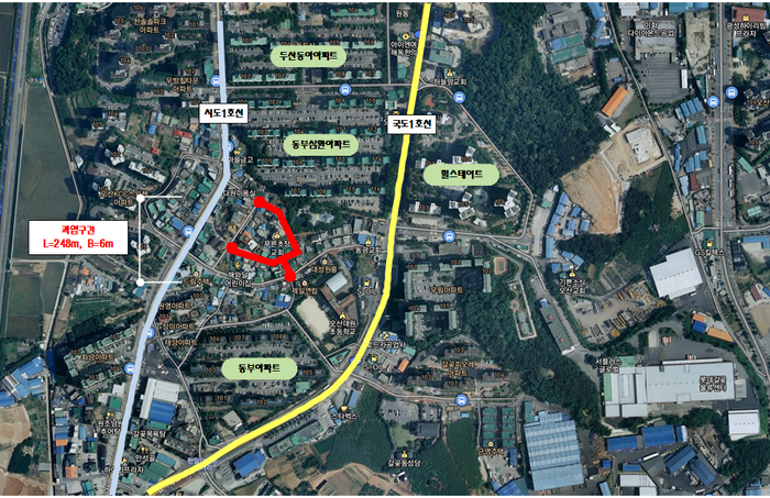 이곳은 그간 도로 폭이 좁아 차량 양방향 통행이 어려워 주민 불편사항이 제기되어 왔을 뿐만 아니라 소방차량도 진입이 어려운 지역이었다.
