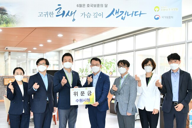 사진/조청식 제1부시장(오른쪽 4번째)가 수원시 보훈복지시설에 위문금을 전달하고 있다. (사진제공=수원시)