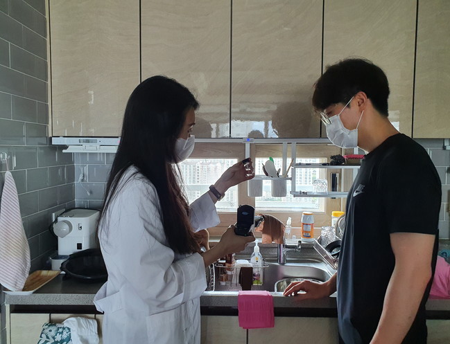 <사진/ 수원시상수도사업소가 운영하는 수돗물 유충민원 전담반에 소속된 미생물 전문가가 민원 발생 가정에 방문해 수돗물을 확인하고 있다.>