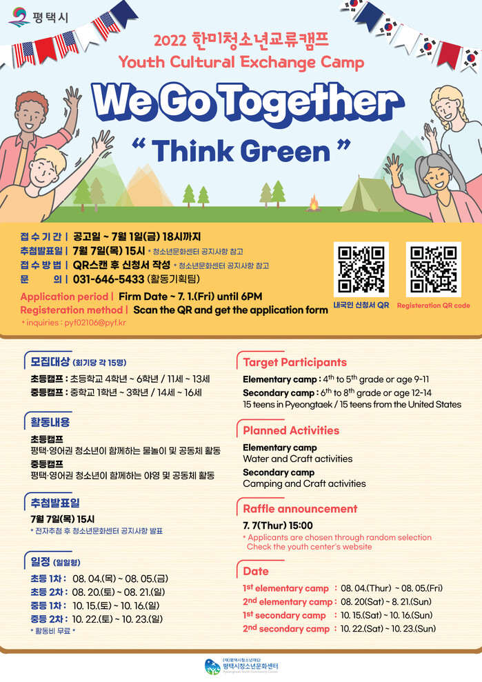 평택시(시장 정장선)가 (재)평택시청소년재단에 위탁 운영하고 있는 평택시청소년문화센터(센터장 곽지숙)는 2022년 한미청소년교류캠프 “We Go Together”에 참가할 청소년을 모집한다.