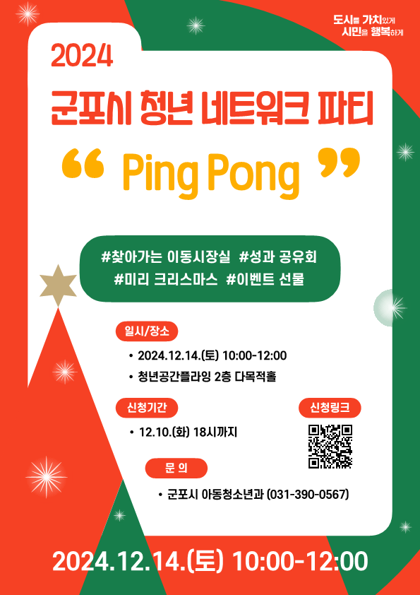 2부 성과공유회는 청년네트워크 파티 “ping pong”이라는 부제를 가지고 편안하고 자유로운 분위기에서 2024년 청년정책 및 활동에 참여했던 청년들의 성과물 전시 및 발표를 통해 한 해 동안 추진한 사업과 활동 결과를 서로 핑퐁(ping pong)하며 지역 청년들과 공유·소통하는 화합의 장을 마련할 예정이다.