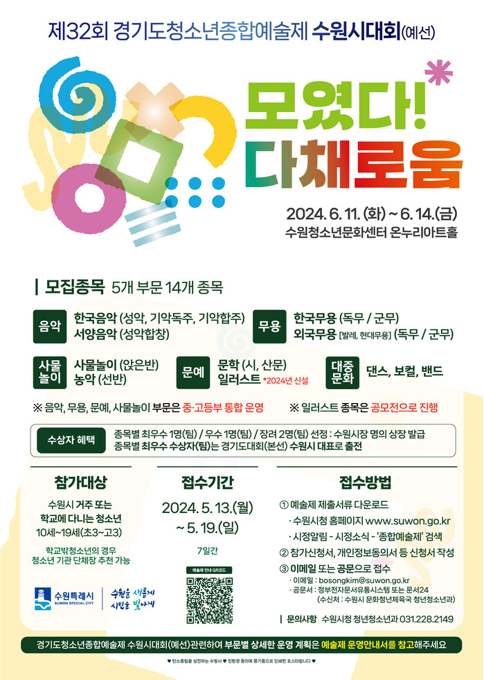 수원시 관계자는 “코로나19 이후 움츠러들었던 청소년 문화·예술 활동이 점점 활성화되고 있다”며 “우리 시 청소년들이 예술적 재능을 마음껏 표출할 수 있는 경기도청소년종합예술제 수원시 대회에 많은 관심과 참여를 부탁드린다”라고 말했다.